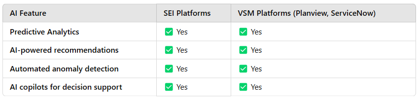 AI is not an SEI-exclusive feature. Instead, SEI and VSM integrate AI-driven analytics, SEI for engineering delivery metrics, and VSM for end-to-end business value flow across the organization.