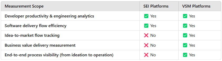 The key difference between these platforms lies in their scope. While SEI focuses on engineering processes, VSM platforms aim to provide end-to-end visibility across the entire software development lifecycle—from ideation and discovery to delivery and operation. The challenge is that many platform vendors position SEI as interchangeable with VSM, when in reality, the two serve different yet complementary purposes.